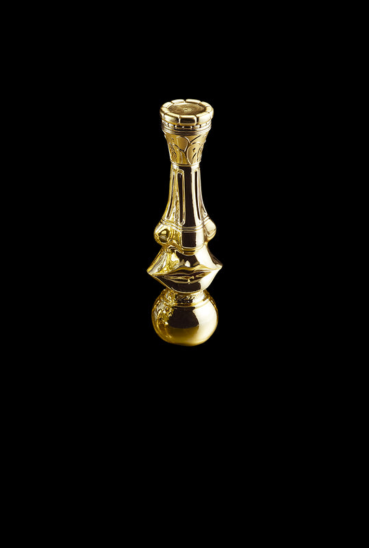 La fabulosa Korynthia se presenta en un sorprendente frasco esculpido, una columna vestida de oro que presenta bajo su capitel la nariz y los labios de un rostro femenino, elemento central del cuadro de Navidad, creado por Dalí para la portada de Vogue en 1946.